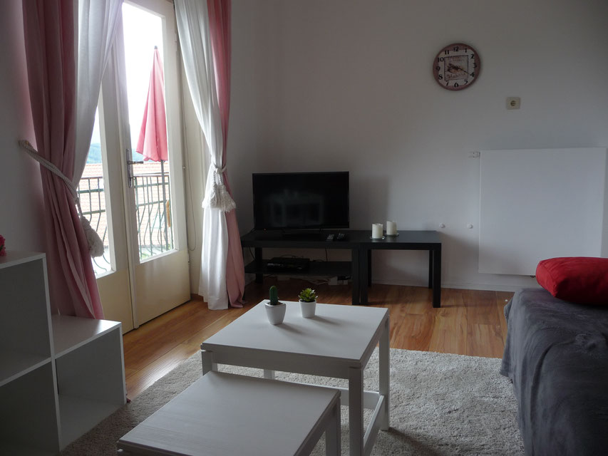 Das Wohnzimmer ist gemütlich eingerichtet und hat ein Sofa zum Relaxen, eine Doppelflügeltür zum Balkon mit einem herrlichen Seeblick sowie Heizung für kühle Sommer- oder kalte Wintertage.